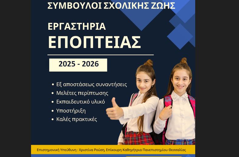 Για τέταρτη συνεχόμενη φορά πραγματοποιείται το εξ αποστάσεως επιμορφωτικό πρόγραμμα «Εργαστήρια Εποπτείας», σε συνδιοργάνωση της Διεύθυνσης Δευτεροβάθμιας Εκπαίδευσης Τρικάλων, των Συμβούλων Εκπαίδευσης με παιδαγωγική ευθύνη των σχολείων της Π.Ε. Ενότητας Τρικάλων και του Εργαστηρίου Ψυχολογίας και Εφαρμογών στην Εκπαίδευση του Παιδαγωγικού Τμήματος Ειδικής Αγωγής του Πανεπιστημίου Θεσσαλίας με επιστημονικά υπεύθυνη την κ. Χριστίνα Ρούση, Επίκουρη Καθηγήτρια Εκπαιδευτικής Ψυχολογίας του Παιδαγωγικού Τμήματος Ειδικής Αγωγής Πανεπιστημίου Θεσσαλίας.
