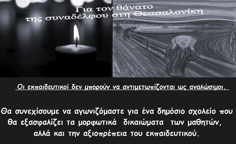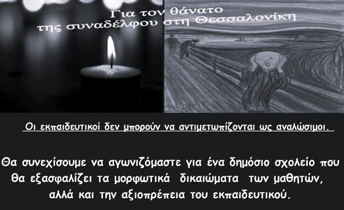 Το Δ.Σ. της ΕΛΜΕ Καρδίτσας εκφράζει τα θερμά του συλλυπητήρια στην οικογένεια και στους οικείους της εκπαιδευτικού. Το τραγικό αυτό γεγονός επαναφέρει με οδυνηρό τρόπο στο προσκήνιο την κατάσταση που έχει διαμορφωθεί στα σχολεία, ως αποτέλεσμα της διαχρονικής αντιεκπαιδευτικής πολιτικής όλων των κυβερνήσεων.