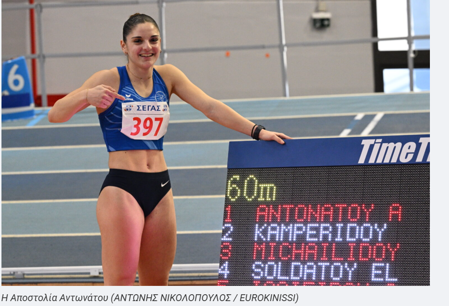 Η νεαρή από την Κεφαλονιά, που ζει εδώ και ενάμιση χρόνο στην Αθήνα μακριά από την οικογένειά της, έτρεξε τα 60 μ. σε 7.33 και βελτίωσε το πανελλήνιο ρεκόρ Κ20 της Κατερίνα Θάνου. Η Αντωνάτου το περασμένο διάστημα συμμετείχε στην προπονητική συγκέντρωση της ομοσπονδίας στο ΟΑΚΑ ως μέλος της εθνικής ομάδας 4×100 μέτρα.
