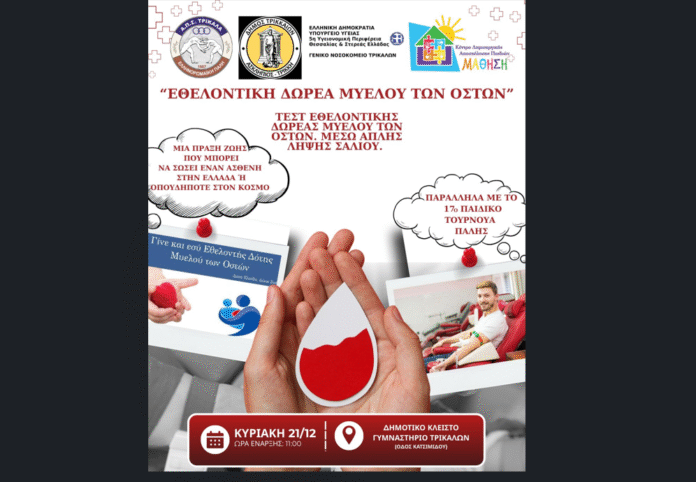 - Την Κυριακή 21/12/2025, ο ΑΠΣ Τρίκαλα, τα ΚΔΑΠ ΜΑΘΗΣΗ, την Μονάδα Πρόληψης του Γενικού Νοσοκομείου Τρικάλων και τον Δήμο Τρικκαίων, συνδιοργανώνουν εκδήλωση με θέμα: «Γίνε ο Ήρωας Κάποιου. Γίνε Εθελοντής Δότης Μυελού των Οστών», στο Κλειστό Γυμναστήριο Τρικάλων (οδός Κατσιμήδου), ώρα έναρξης 10:00-14:00 (στα πλαίσια διεξαγωγής του 17ου Πανελλήνιου Παιδικού Τουρνουά Πάλης).