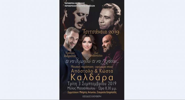 Η Περιφερειακή Ενότητα Τρικάλων της Περιφέρειας Θεσσαλίας διοργανώνει, στο πλαίσιο των «Τσιτσανείων 2019», τη μουσική παράσταση «τι να θυμηθώ, τι να ξεχάσω…», αφιερωμένη στον μεγάλο λαϊκό συνθέτη Απόστολο Καλδάρα και στον γιο του Κώστα Καλδάρα, δυο ανθρώπους με στενή οικογενειακή σχέση, αλλά με ξεχωριστούς δρόμους στο ελληνικό τραγούδι.