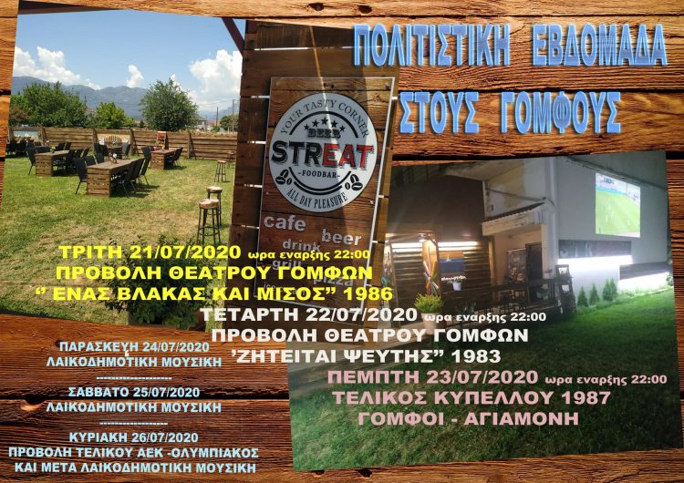 Το “Streat” cafe-grill στους Γόμφους, ξεκινάει από απόψε Τρίτη 21/07/2020 μέχρι και την Κυριακή, (ημέρα του πανηγυριού μας), πολιτιστική εβδομάδα με προβολές έργων του θεάτρου Γόμφων, παραστάσεις που παίχτηκαν από Γομφαίους ερασιτέχνες ηθοποιούς και τον τελικό κυπέλλου ποδοσφαίρου του 1985 και με λαϊκοδημοτική μουσική, … κάνοντας έτσι μια ευχάριστη ιστορική αναδρομή στα πολιτιστικά δρώμενα του χωριού μας μιας άλλης όμορφης εποχής…