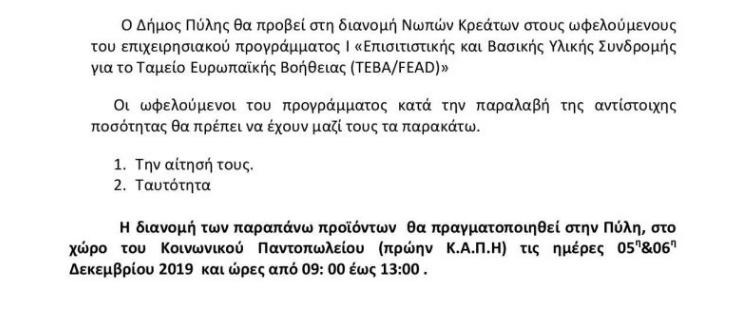 Διανομή Νωπών Κρεάτων στους ωφελούμενους του προγράμματος KEA–TEBA (τρόφιμα) από το Κοινωνικό Παντοπωλείο Πύλης