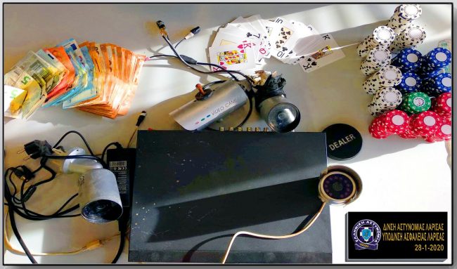 Στο πλαίσιο στοχευμένων ελέγχων για την καταπολέμηση της παράνομης διεξαγωγής τυχερών παιγνίων, εντοπίστηκε χθες (28-01-2020) το βράδυ στη Λάρισα, από αστυνομικούς της Υποδιεύθυνσης Ασφάλειας Λάρισας, χώρος όπου στεγάζεται σωματείο, στον οποίο διεξαγόταν το παράνομο τυχερό παίγνιο «πόκερ».