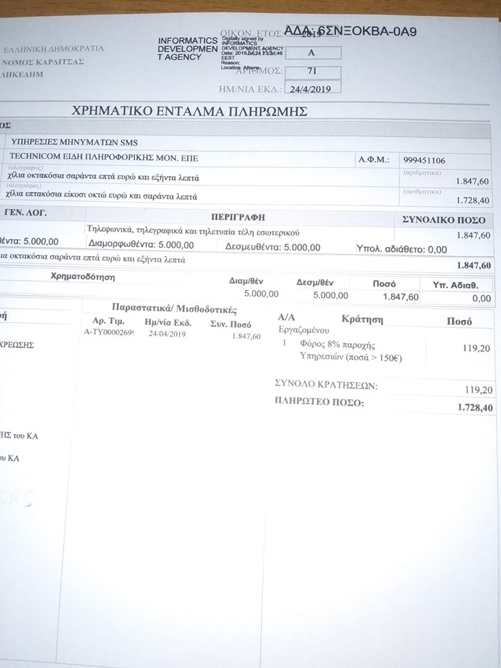 Στις 24/4/2019 δαπάνησαν 1847,60 ευρώ για υπηρεσίες μηνυμάτων SMS που αντιστοιχούν περίπου σε 100.000 SMS. Που εστάλησαν ;