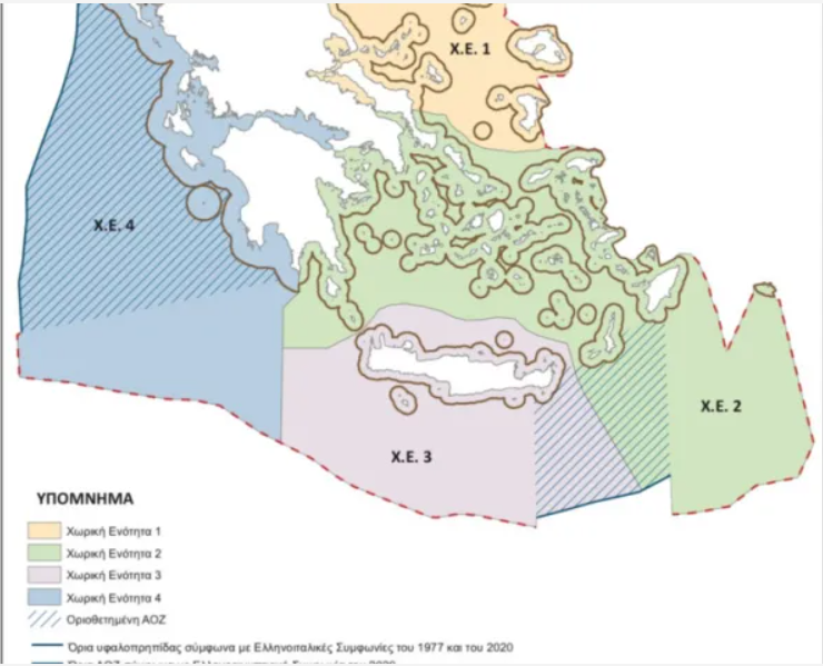 Θυμίζουμε ότι τον Απρίλιο του 2025 εκδόθηκε η πράξη συγκρότησης της Εθνικής Χωρικής Στρατηγικής για τον Θαλάσσιο Χώρο, με την οποία αποτυπώνεται σε χάρτη ο συνολικός Θαλάσσιος Χωροταξικός Σχεδιασμός της χώρας. Λίγους μήνες αργότερα, τον Νοέμβριο, η Ελλάδα κατέθεσε στην αρμόδια διεύθυνση της Ευρωπαϊκή Ένωσης συμπληρωματικό χάρτη, ο οποίος περιλαμβάνει τόσο τη δυνητική ΑΟΖ βάσει του νόμου 4001 του 2011 όσο και τις περιοχές όπου έχει ήδη κηρυχθεί ΑΟΖ με τις συμφωνίες που έχουν συναφθεί με την Αίγυπτο και την Ιταλία.