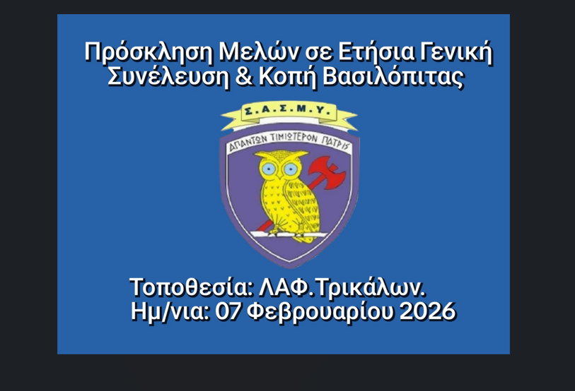 Το Διοικητικό Συμβούλιο του Συνδέσμου Αποφοίτων Σχολής Μονίμων Υπαξιωματικών (ΣΑΣΜΥ), μετά από ομόφωνη απόφαση του ΔΣ, σε εκτέλεση των αποφάσεων της έκτακτης γενικής συνέλευσης την 29 Ιουνίου 2025 καλεί τα μέλη του σε ετήσια τακτική γενική συνέλευση.