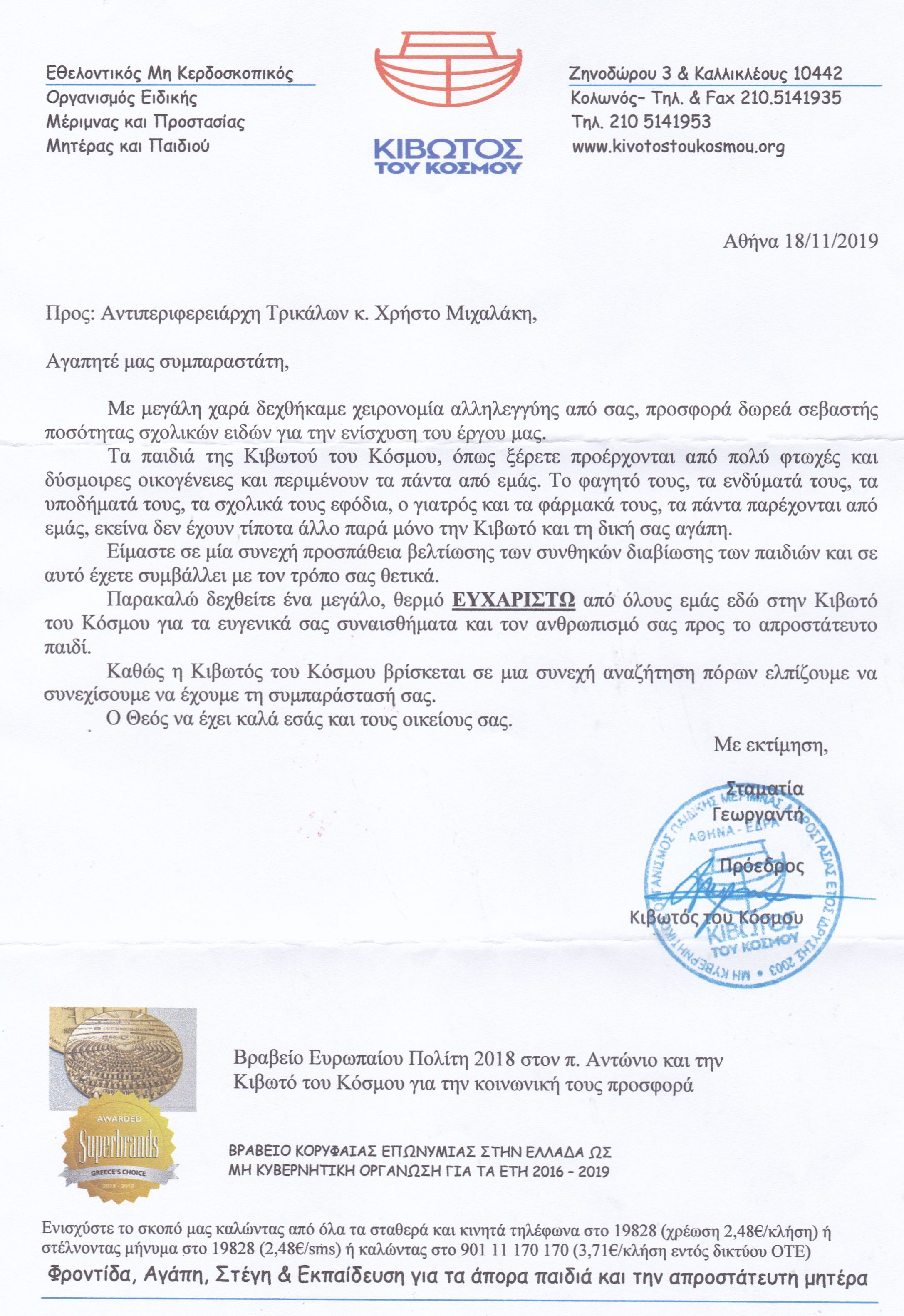 Ευχαριστήριο μήνυμα στον Αντιπεριφερειάρχη Χρ. Μιχαλάκη, από την “Κιβωτό του κόσμου”