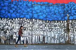 A woman walks past a mural depicting many famous Serbs and the Serbian national flag in Belgrade on April 22, 2016. Serbian Prime Minister Aleksandar Vucic, who is bidding for another four years in power in Sunday's general election, is a former ultra-nationalist and close ally of Slobodan Milosevic remade as a pro-European liberal. In a political transformation viewed by critics as pragmatic rather than ideological, the tall 46-year-old Vucic now leads Serbia's efforts to join the European Union. / AFP / ANDREJ ISAKOVIC        (Photo credit should read ANDREJ ISAKOVIC/AFP/Getty Images)