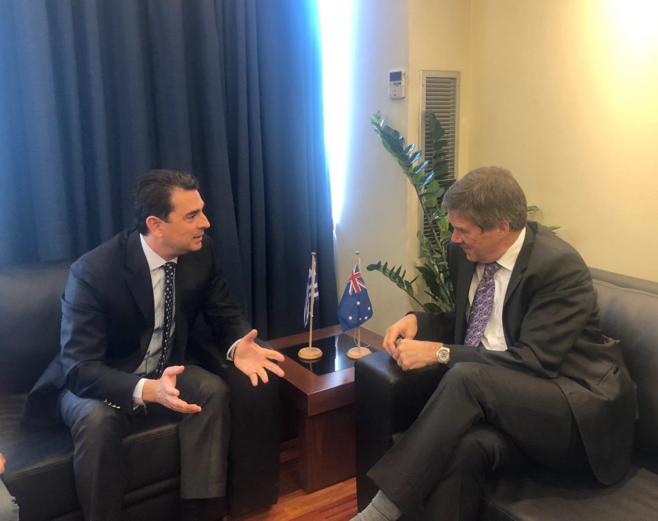 Για τις προοπτικές ανάπτυξης των οικονομικών και εμπορικών σχέσεων Ελλάδας – Αυστραλίας, με επίκεντρο τον αγροτικό τομέα, συζήτησαν κατά τη συνάντηση τους την Τρίτη ο Υφυπουργός Αγροτικής Ανάπτυξης και Τροφίμων Κώστας Σκρέκας με τον Επιτετραμμένο της Πρεσβείας της Αυστραλίας στην Αθήνα, Jon Philip.