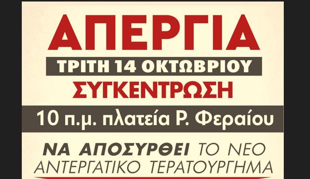 Το Εργατικό Κέντρο Τρικάλων, σε συνεδρίαση του την Πέμπτη 9 Οκτωβρίου, συζήτησε και εκτίμησε την απεργιακή κινητοποίηση τις 1η Οκτώβρη, όπου οι εργαζόμενοι έδειξαν την αποφασιστικότητά τους να μη συμβιβαστούν με τον εργασιακό Μεσαίωνα που σχεδιάζουν μεγαλοεργοδοσία και κυβέρνηση. Αποφάσισε να καλέσει σε νέο αγωνιστικό ξεσηκωμό με Απεργία την Τρίτη 14 Οκτώβρη ημέρα συζήτησης στην Βουλή , για να μην περάσει, το νομοσχέδιο για την 13ωρη δουλειά, την ευελιξία και οι άλλες ρυθμίσεις που κάνουν τον βίο – αβίωτο για τους εργαζόμενους.