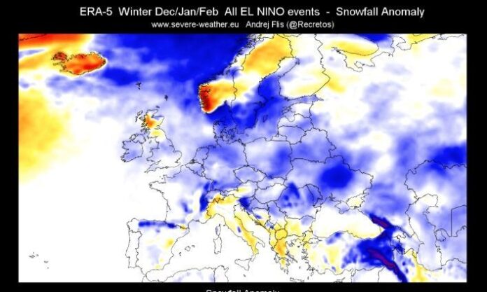 Ένα ώριμο El Niño τον χειμώνα τείνει να ενισχύει τις χαμηλές πιέσεις στον νότιο Ατλαντικό και να διοχετεύει την πολική ψυχρή αέρια μάζα σε διαδρομές που ευνοούν τη νότια και κεντρική Ευρώπη. Τα ιστορικά δεδομένα δείχνουν ότι σε τέτοιους χειμώνες αυξάνονται οι πιθανότητες για πιο ψυχρά επεισόδια και περισσότερες χιονοπτώσεις από τη νότια Βρετανία, μέσω κεντρικής Ευρώπης, έως τα Βαλκάνια.