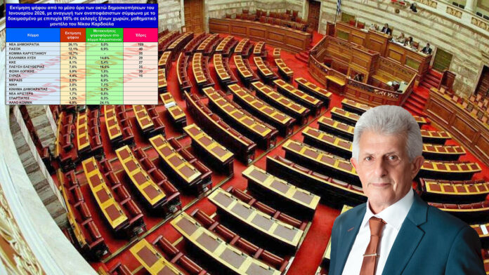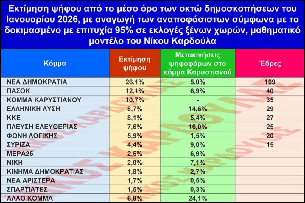 Καρδούλας: Εκτίμηση ψήφου σύμφωνα με το μέσο όρο των οκτώ δημοσκοπήσεων Ιανουαρίου 2026 – Αναγωγή αναποφάσιστων με μοντέλο μου