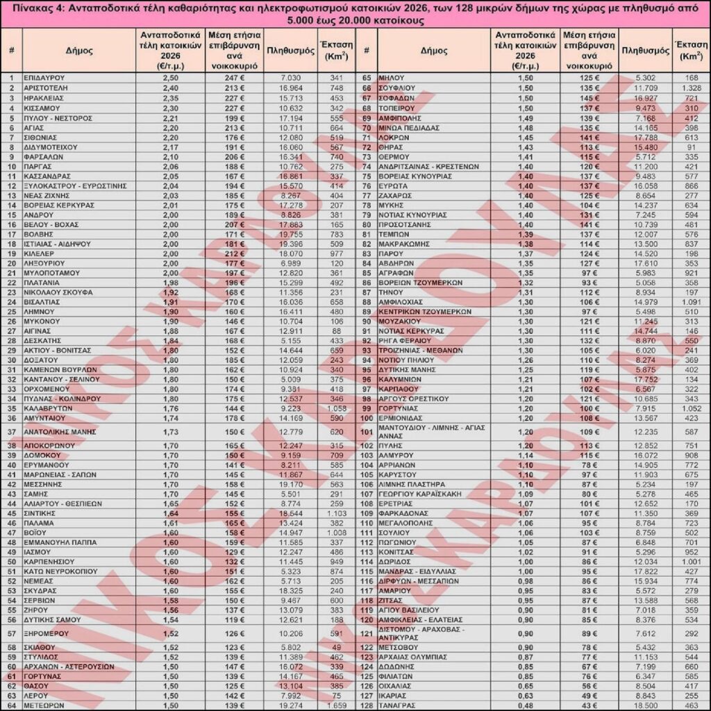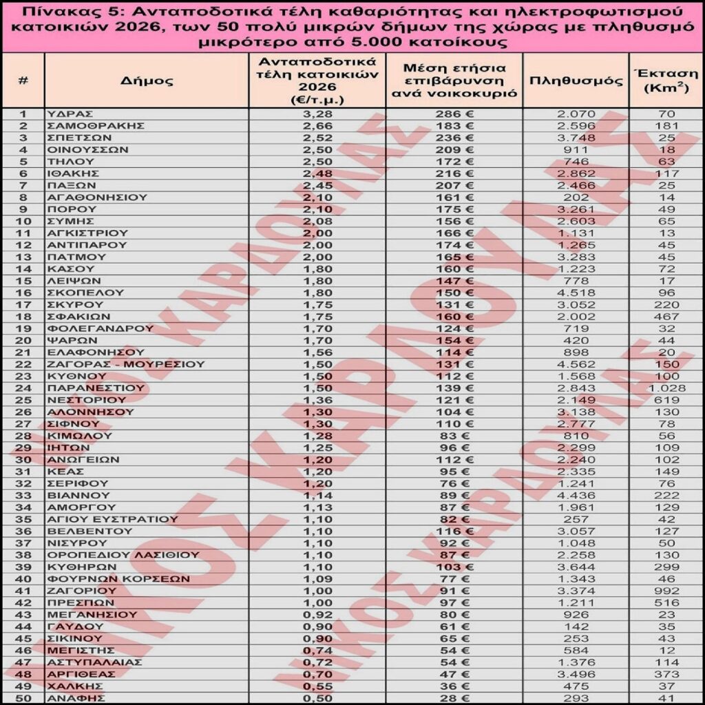 Ανταποδοτικά τέλη καθαριότητας και ηλεκτροφωτισμού κατοικιών 2026, των 50 πολύ μικρών δήμων της χώρας με πληθυσμό μικρότερο από 5.000 κατοίκους