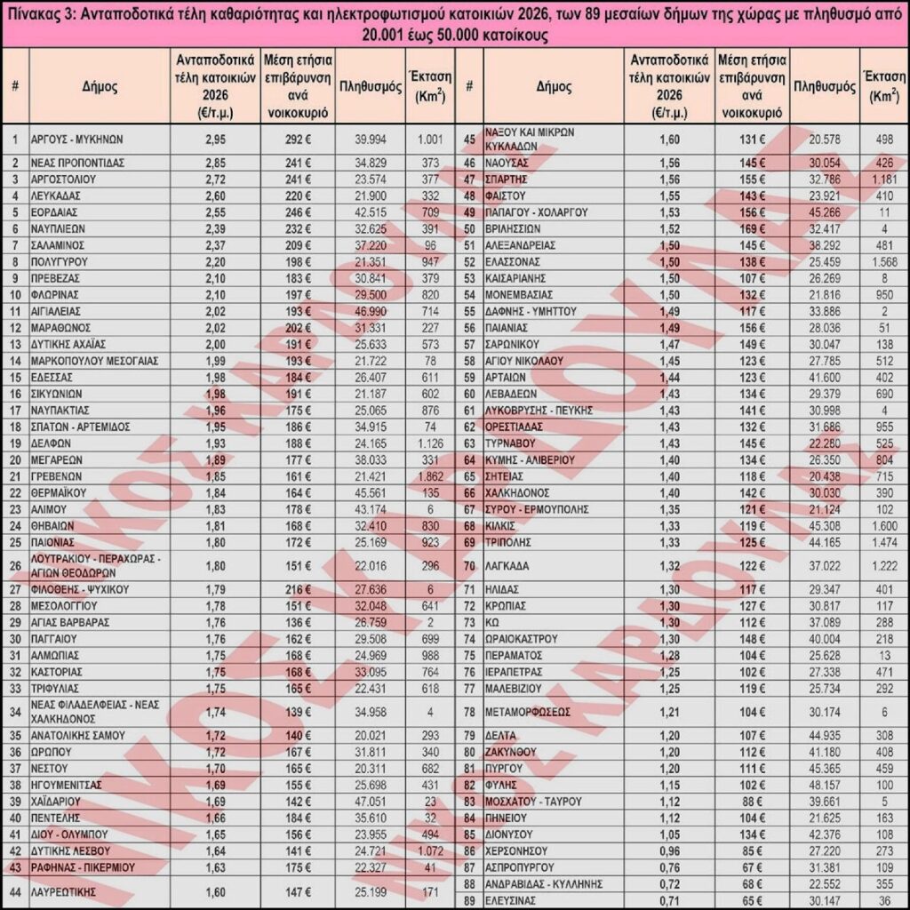 Ανταποδοτικά τέλη καθαριότητας και ηλεκτροφωτισμού κατοικιών 2026, των 89 μεσαίων δήμων της χώρας με πληθυσμό από 20.001 έως 50.000 κατοίκους