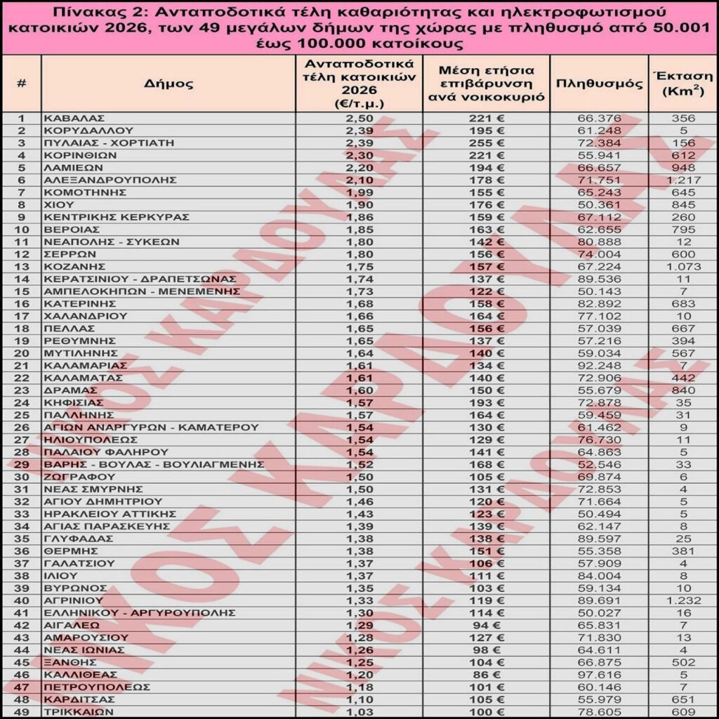 Ανταποδοτικά τέλη καθαριότητας και ηλεκτροφωτισμού κατοικιών 2026, των 49 μεγάλων δήμων της χώρας με πληθυσμό από 50.001 έως 100.000 κατοίκους
