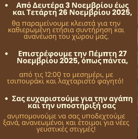 Κλειστή για ανακαίνιση η αγαπημένη ταβέρνα το “Τσαγαλί”. Από τις 27/11 & πάλι μαζί!!!