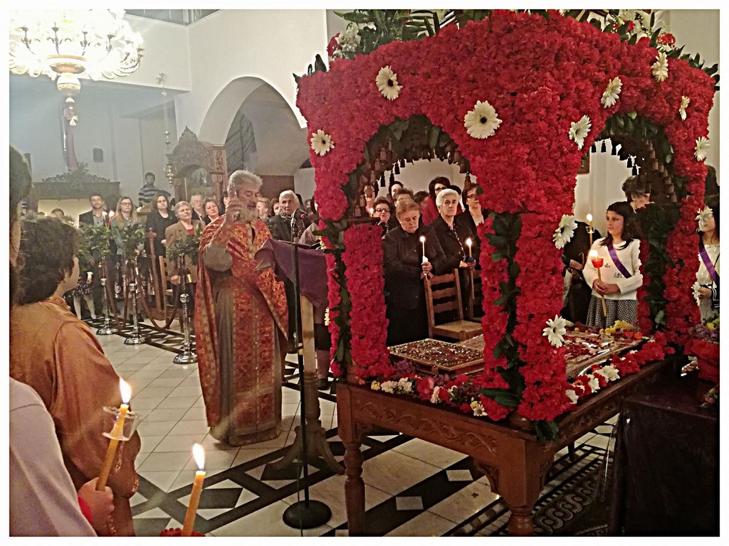 Η Ακολουθία τελέστηκε από τον εφημέριο του ναού π. Ηλία Λόλα, ο οποίος ενώπιον του Επιταφίου, έψαλλε τον υπέροχο ύμνο «Ω, γλυκύ μου έαρ, γλυκότατόν μου τέκνον, που έδυ σου το κάλλος».
