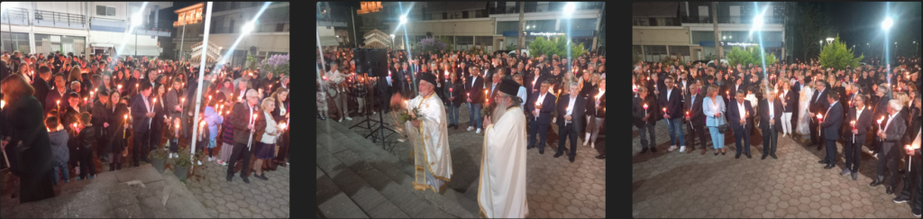 Στην συνέχεια στον αύλιο χώρο της Εκκλησίας έγινε η Ανάγνωση του Ευαγγελίου και το δυνατό ψάλσιμο του «Χριστός Ανέστη» συνοδευόμενο από το χαρμόσυνο ήχο της καμπάνας του Ναού και τα βεγγαλικά που φώτισαν τον ουρανό της Πύλης.