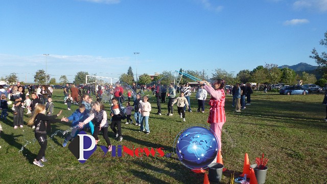 Ο δυνατός αέρας δεν στάθηκε όμως ικανός να χαλάσει άλλη μια δράση στον ίδιο χώρο του γηπέδου, που περιελάμβανε την χειροποίητη κατασκευή με απλά υλικά, μικρών αερόστατων από την κα Μαρία, που δωρίζονταν στα παιδιά, ενώ μία ανιματέρ εξανέμιζε στον χώρο πολύχρωμες μπουρμπουλήθρες που δημιουργούσαν ένα διαδραστικό και ονειρικό σκηνικό, όπου η φαντασία δεν είχα όρια. Με άλλα λόγια, ένας ιδανικός συνδυασμός εφέ και παιδικής απόλαυσης μεταξύ ονείρου και πραγματικότητας, ρομαντισμού και κωμωδίας, όπως μόνο οι φυσαλίδες σαπουνιού μπορούν να δώσουν.