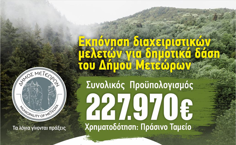 Νέα σημαντική χρηματοδότηση εξασφάλισε ο Δήμος Μετεώρων μετά από έγκριση του Πράσινου Ταμείου για την εκπόνηση διαχειριστικών μελετών δημοτικών δασών, συνολικού προϋπολογισμού 227.970 ευρώ.