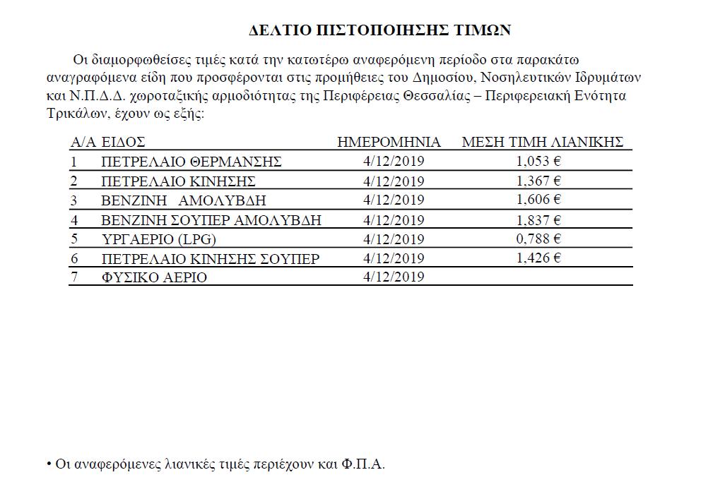 Οι μέσες διαμορφωθείσες τιμές καυσίμων στην Π.Ε. Τρικάλων κατά την 4ην/12