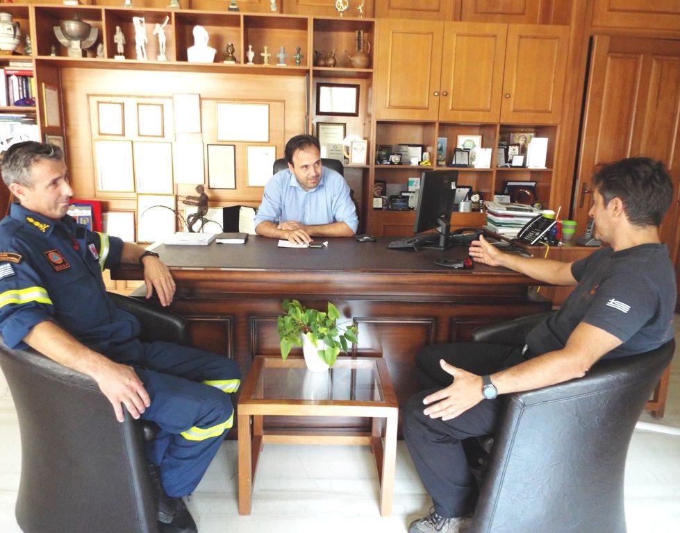 Ο κ. Δημήτρης Παπαστεργίου υποδέχθηκε τους κ. Λάμπρο Κίτσο και Πασχάλη Δρομπούρα στο Δημαρχείο Τρικκαίων, όπου είχαν συζήτηση και αντήλλαξαν απόψεις για τα θέματα αρμοδιότητας της ΕΜΑΚ. Η Ειδική Μονάδα Αντιμετώπισης Καταστροφών, όπως εξήγησαν οι δύο αξιωματικοί στον Δήμαρχο, έχει ως τομέα ευθύνης ολόκληρη τη Θεσσαλία και αναλαμβάνει πλήθος διαφορετικών και άκρως επικίνδυνων αποστολών, με γνώμονα, βεβαίως τη διάσωση ανθρώπινων ζωών και περιουσιών.