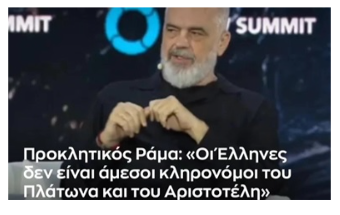 «Οι Έλληνες είναι οι απόγονοί μας, διότι εμείς χτίσαμε την Ελλάδα, ακόμα και τον Παρθενώνα, εμείς απελευθερώσαμε την Ελλάδα, εμείς είμαστε απόγονοι του Πλάτωνα και του Αριστοτέλη και όχι οι σημερινοί Έλληνες,…» οι εκάστοτε δηλώσεις του Αλβανού Πρωθυπουργού Ε. Ράμα, για να καλύψει το ναρκοθετημένο κράτος του, την διεφθαρμένη δικαιοσύνη, την διαφθορά και την τάση των νέων της χώρας να την εγκαταλείψουν. Μεταχειρίζεται τον εθνικισμό ως το μοναδικό μέσο που βρίσκει έδαφος στην σημερινή κοινωνία της χώρας.