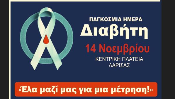 Δράση ενημέρωσης και ευαισθητοποίησης για τον Σακχαρώδη Διαβήτη πραγματοποιείται σήμερα, Πέμπτη 13 Νοεμβρίου 2025, από τις 10:00 έως τις 14:00 και από τις 17:00 έως τις 20:30, στην Κεντρική Πλατεία Λάρισας.