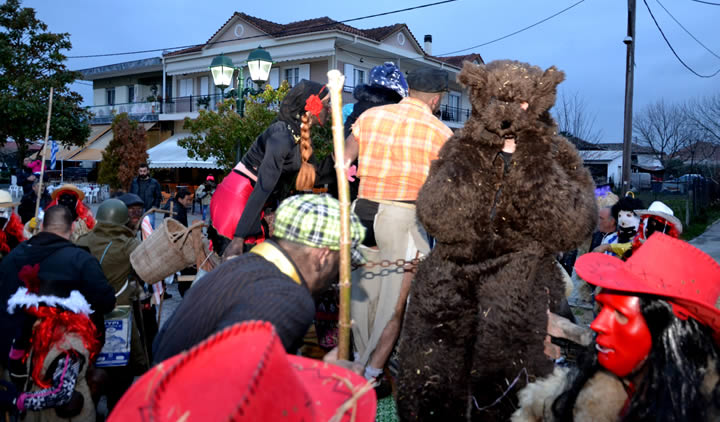 Την Καθαρά Δευτέρα γίνεται η αναπαράσταση της αρκούδας, το κλέψιμο μιας αρκούδας από τους χωρικούς (κουδουνάδες) και προσφέρονται νηστίσιμα εδέσματα (φασολάδα-λαγάνα) και άφθονο κρασί στους παραβρισκόμενους. Το εορταστικό διήμερο της αποκριάς συνοδεύεται από ζωντανή ορχήστρα με Δημοτικά τραγούδια.