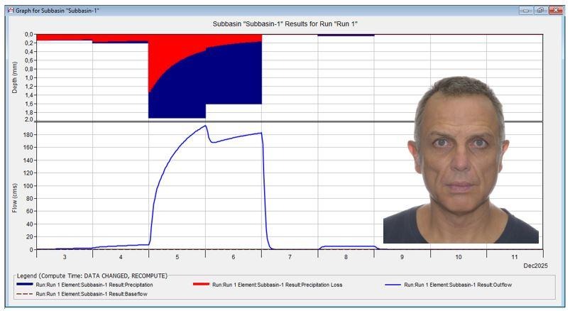 Επιπλέον, αρχικά, στην παρακάτω εικόνα απεικονίζεται το, “προσομοιωμένο ρεαλιστικό”, «διάγραμμα / ιστόγραμμα βροχόπτωσης / απορροής» του χρονικού διαστήματος, “03-08/12/2025” (“186,80 mm”), (το οποίο και «απέδωσε» την, “προσομοιωμένη ρεαλιστική”, παροχή αιχμής νερού και συγκεκριμένα «194,10 κυβικά μέτρα ανά δευτερόλεπτο» ή αλλιώς «194,10 m3/sec»), [το οποίο και «απέδωσε», λόγω του ακραίου μετεωρολογικού φαινομένου με την κωδική ονομασία «Byron», την, “προσομοιωμένη ρεαλιστική”, συνολική ποσότητα νερού, συγκεκριμένα, «29.492.100 κυβικά μέτρα (τόνους νερού)» ή αλλιώς «29.492.100 m3 (τόνους νερού)»], και το αντίστοιχο, “προσομοιωμένο ρεαλιστικό”, «υδρογράφημα πλημμύρας» που προκύπτει από το συγκεκριμένο, “προσομοιωμένο ρεαλιστικό”, επεισόδιο βροχόπτωσης, (λόγω του μετεωρολογικού φαινομένου με την κωδική ονομασία «Byron»), (η ανάλυση και οι υπολογισμοί έγιναν με το ελεύθερο στο διαδίκτυο λογισμικό «HEC-HMS» του «U.S.A. Army Corps of Engineers» δηλαδή του «Σώματος Μηχανικών του Στρατού των Η.Π.Α.») [1,2,4,5,6.1-6.12,7.1-7.2].