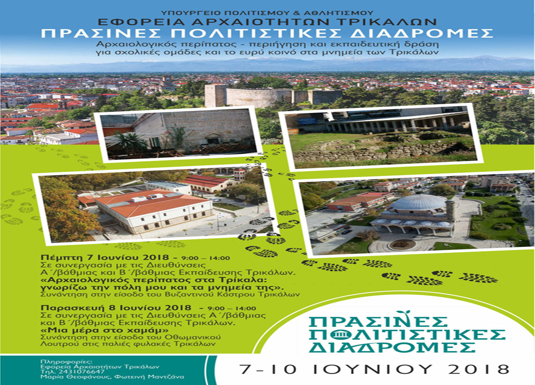 Η Εφορεία Αρχαιοτήτων Τρικάλων στο πλαίσιο του θεσμού του Υπουργείου Πολιτισμού και Αθλητισμού «Πράσινες Πολιτιστικές Διαδρομές», διοργανώνει στις 7 και 8 Ιουνίου 2018 τις ακόλουθες δράσεις: