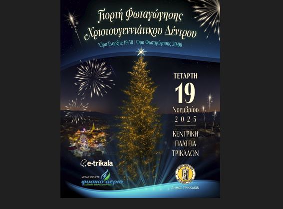 Η μεγάλη στιγμή έφτασε! Το απόγευμα της Τετάρτης 19 Νοεμβρίου 2025 τα Τρίκαλα, τα χωριά, ολόκληρη η περιοχή, εισέρχονται στην εορταστική περίοδο των Χριστουγέννων, καθώς ο Δήμος Τρικκαίων φωταγωγεί το χριστουγεννιάτικο δέντρο!