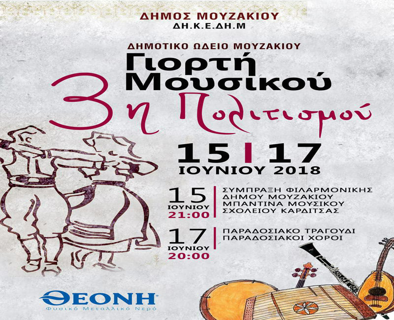 Την Παρασκευή 15 Ιουνίου 2018 και ώρα 9:00 μ.μ. θα πραγματοποιηθεί στην Κεντρική Πλατεία Μουζακίου συναυλία Φιλαρμονικών Ορχηστρών. Συμμετέχει η Δημοτική Φιλαρμονική Μουζακίου της ΔΗ.Κ.Ε.ΔΗ.Μ. και η μπαντίνα του Μουσικού Σχολείου Καρδίτσας.