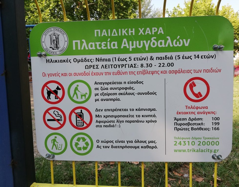 Μια πρωτότυπη ιδέα για τις παιδικές χαρές είχε ο Δήμος Τρικκαίων. Και την υλοποίησε με τις πινακίδες στις νέες, 40 πιστοποιημένες παιδικές χαρές που κατασκεύασε. Συγκεκριμένα, στις οδηγίες χρήσης που ανήρτησε, προτρέπει γονείς και κηδεμόνες να μην καπνίζουν και να μη χρησιμοποιούν το κινητό!