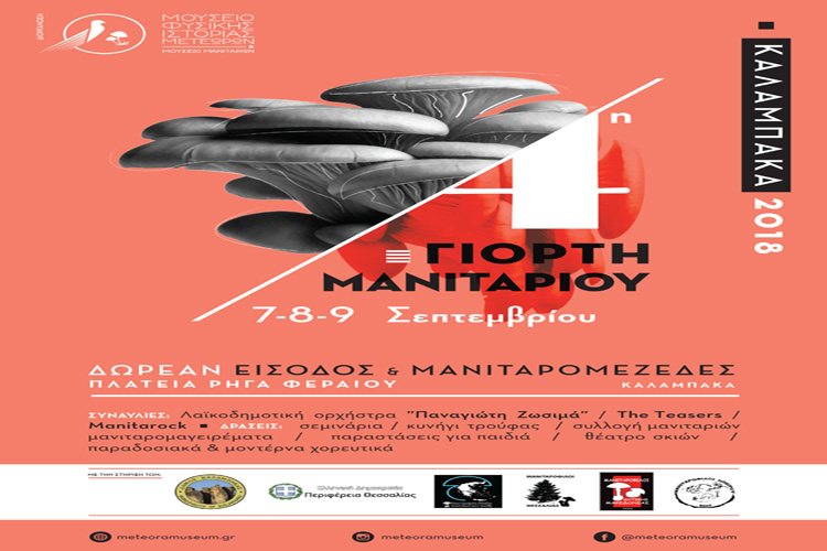 Η 4η Γιορτή Μανιταριού θα πραγματοποιηθεί φέτος στις 7, 8 & 9 Σεπτεμβρίου στην Καλαμπάκα. Η γιορτή αυτή, που διοργανώνεται από το Μουσείο Φυσικής Ιστορίας Μετεώρων και Μουσείο Μανιταριών, έχει γίνει θεσμός πλέον για την περιοχή, ενώ οι προσδοκίες όλων έχουν αυξηθεί μετά τη μεγάλη επιτυχία των τριών προηγούμενων διοργανώσεων.