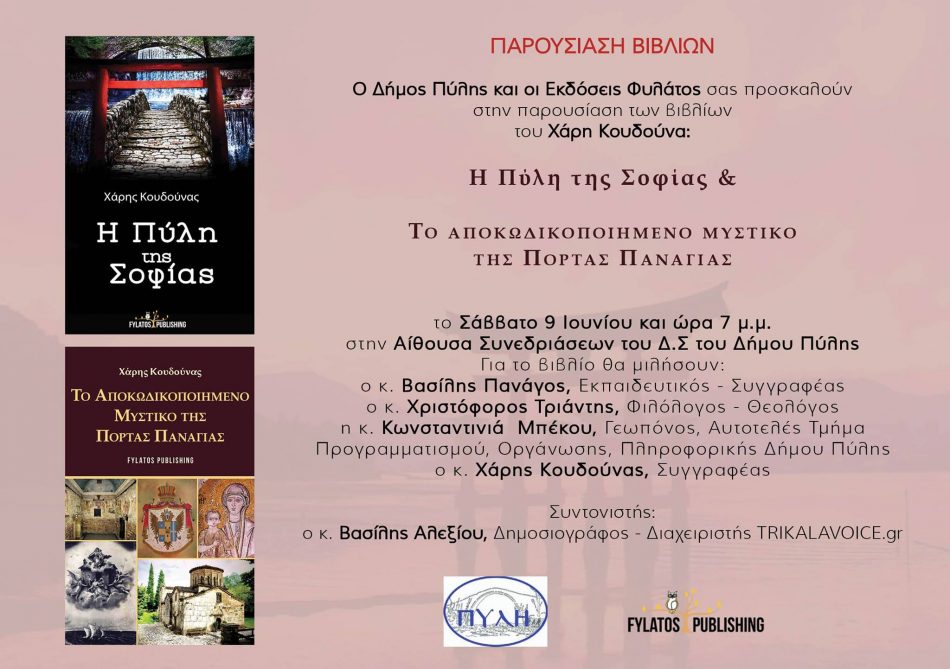 Ο Δήμος Πύλης και οι Εκδόσεις “Φυλάτος” σας προσκαλούν στην παρουσίαση των βιβλίων του Χάρη Κουδούνα: