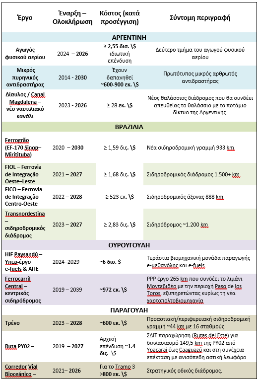 Τα έργα που δρομολογούνται σε Αργεντινή, Βραζιλία, Ουρουγουάη και Παραγουάη συνθέτουν ένα εκτεταμένο επενδυτικό πρόγραμμα υποδομών και ενέργειας στη Νότια Αμερική, συνολικού ύψους περίπου 19,9 δισ. δολαρίων. Περιλαμβάνουν αγωγούς φυσικού αερίου, καινοτόμα πυρηνικά και έργα ΑΠΕ, νέα ναυτιλιακά κανάλια, καθώς και μεγάλης κλίμακας σιδηροδρομικούς και οδικούς διαδρόμους που ενισχύουν τη συνδεσιμότητα, τα logistics και την ενεργειακή ασφάλεια της περιοχής.