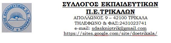 Το Δ.Σ. του Συλλόγου Εκπαιδευτικών Π.Ε. Τρικάλων, για τη διευκόλυνση συμμετοχής όλων των συναδέλφων στην προγραμματισμένη πανελλαδική συγκέντρωση – κινητοποίηση στο Υπουργείο Παιδείας στην Αθήνα, την Παρασκευή 1 Φεβρουαρίου 2019 και ώρα 13:00, πέραν της τρίωρης στάσης εργασίας που έχει κηρύξει η Ομοσπονδία (ΔΟΕ), για το τέλος της πρωινής και την αρχή της απογευματινής ζώνης, κηρύσσει επιπλέον μία τρίωρη στάση εργασίας για τις τρεις πρώτες ώρες του πρωινού κύκλου και τις τρεις τελευταίες της απογευματινής ζώνης.