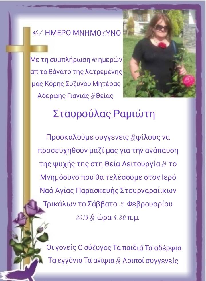 ΑρχικήΚοινωνικάΤέλεση 40ήμερου μνημόσυνου Σταυρούλας Ραμιώτη, το Σάββατο 2 Φεβρουαρίου