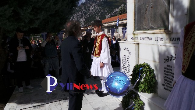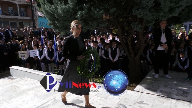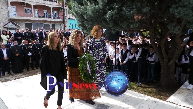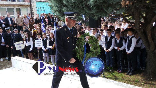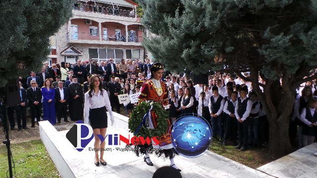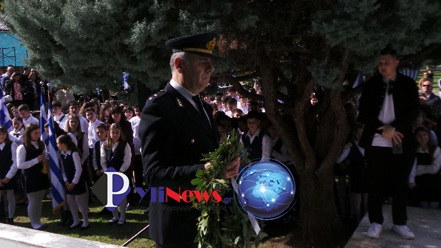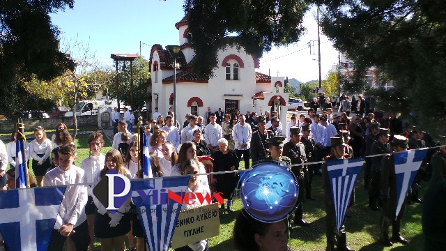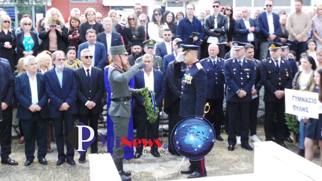 Κατόπιν έγινε μετάβαση στο Μνημείο Ηρώων, στον αύλειο χώρο του ΕΠΑΛ Πύλης, όπου υπό του Αρχιερατικού Επιτρόπου Πύλης π. Δημ. Κατσαρού, ετελέσθη επιμνημόσυνη δέηση, ενώ πραγματοποιήθηκε κατάθεση στεφάνων από τις Αρχές και τους Φορείς της πόλης, τήρηση ενός λεπτού σιγής & η ανάκρουση του Εθνικού Ύμνου, που εκφωνήθηκε από τους σπουδαστές του αγήματος της ΣΜΥ.
