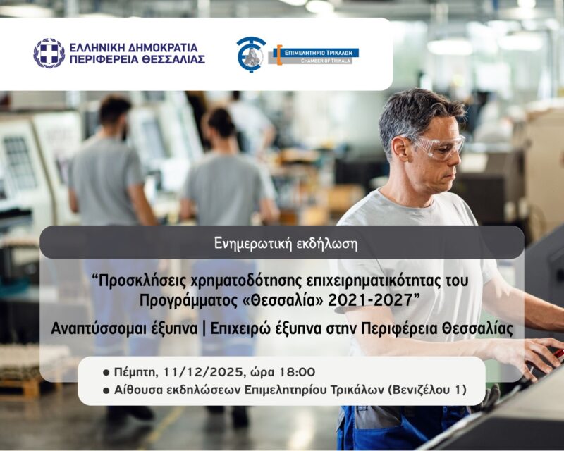 Το Επιμελητήριο Τρικάλων και η Περιφέρεια Θεσσαλίας διοργανώνουν ανοιχτή ενημερωτική εκδήλωση με θέμα: “Προσκλήσεις χρηματοδότησης επιχειρηματικότητας του Προγράμματος «Θεσσαλία» 2021-2027”, την Πέμπτη 11 Δεκεμβρίου 2025 και ώρα 18:00, στην αίθουσα εκδηλώσεων του Επιμελητηρίου Τρικάλων (Βενιζέλου 1, Τρίκαλα).