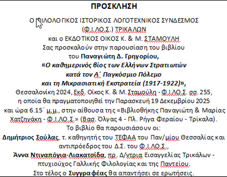 Την Παρασκευή 19/12, παρουσίαση βιβλίου από τον ΦΙΛΟΣ, στα Τρίκαλα