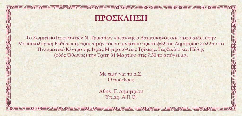 Την Τρίτη 31/3 η εκδήλωση του Σωματείου Ιεροψαλτών Ν. Τρικάλων