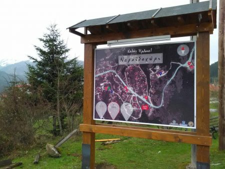 Στην πινακίδα εικονίζεται λεπτομερής κάτοψη του χωριού, με αρίθμηση στις επιχειρήσεις – μέλη και διαχωρισμός τους σε ενότητες… πχ Διαμονή- Εστίαση-Καφε Μπαρ κλπ.