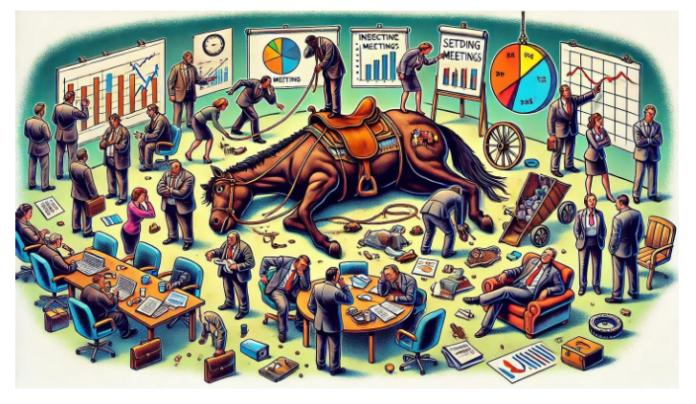 • Δημιουργούμε επιτροπές ή ομάδες εργασίας για να αναλύσουν το πρόβλημα του νεκρού αλόγου από όλες τις γωνίες. Αυτές οι επιτροπές εργάζονται για μήνες, σηκώνουν αναφορές και τελικά καταλήγουν στο προφανές: το άλογο είναι νεκρό.