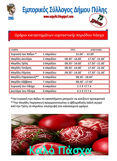 ΑρχικήΕργασία - ΑπασχόλησηΤο πρόγραμμα των καταστημάτων στο Δ. Πύλης, για την περίοδο του Πάσχα