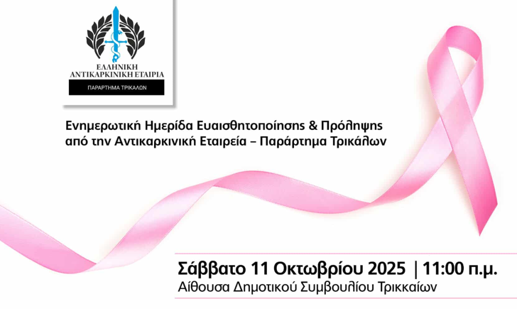 Η Ελληνική Αντικαρκινική Εταιρεία – Παράρτημα Τρικάλων διοργανώνει το Σάββατο 11 Οκτωβρίου και ώρα 11:00 π.μ. στην αίθουσα του Δημοτικού Συμβουλίου του Δήμου Τρικκαίων