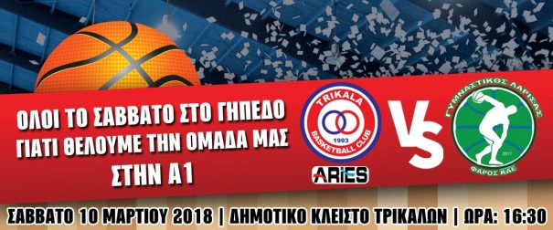 Το Σάββατο 10 Μαρτίου η ομάδα των Τρικάλων BC Aries υποδέχεται στις 4.30 το απόγευμα στο Δημοτικό Κλειστό τον Γυμναστικό Λάρισας Φάρο σε ένα καθοριστικό παιχνίδι για την παραμονή.