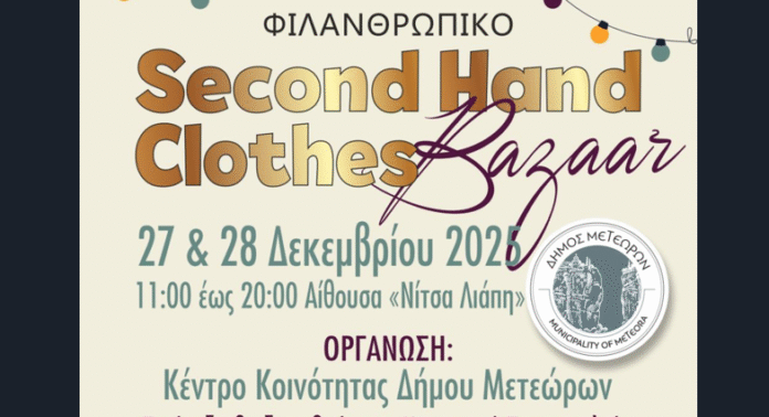 Το Κέντρο Κοινότητας Δήμου Μετεώρων διοργανώνει ένα Φιλανθρωπικό Second Hand Clothes Bazaar, το οποίο θα πραγματοποιηθεί τo Σάββατο 27 και την Κυριακή 28 Δεκεμβρίου 2025, από 11:00 το πρωί έως τις 20:00 το βράδυ, στην Αίθουσα «Νίτσα Λιάπη».